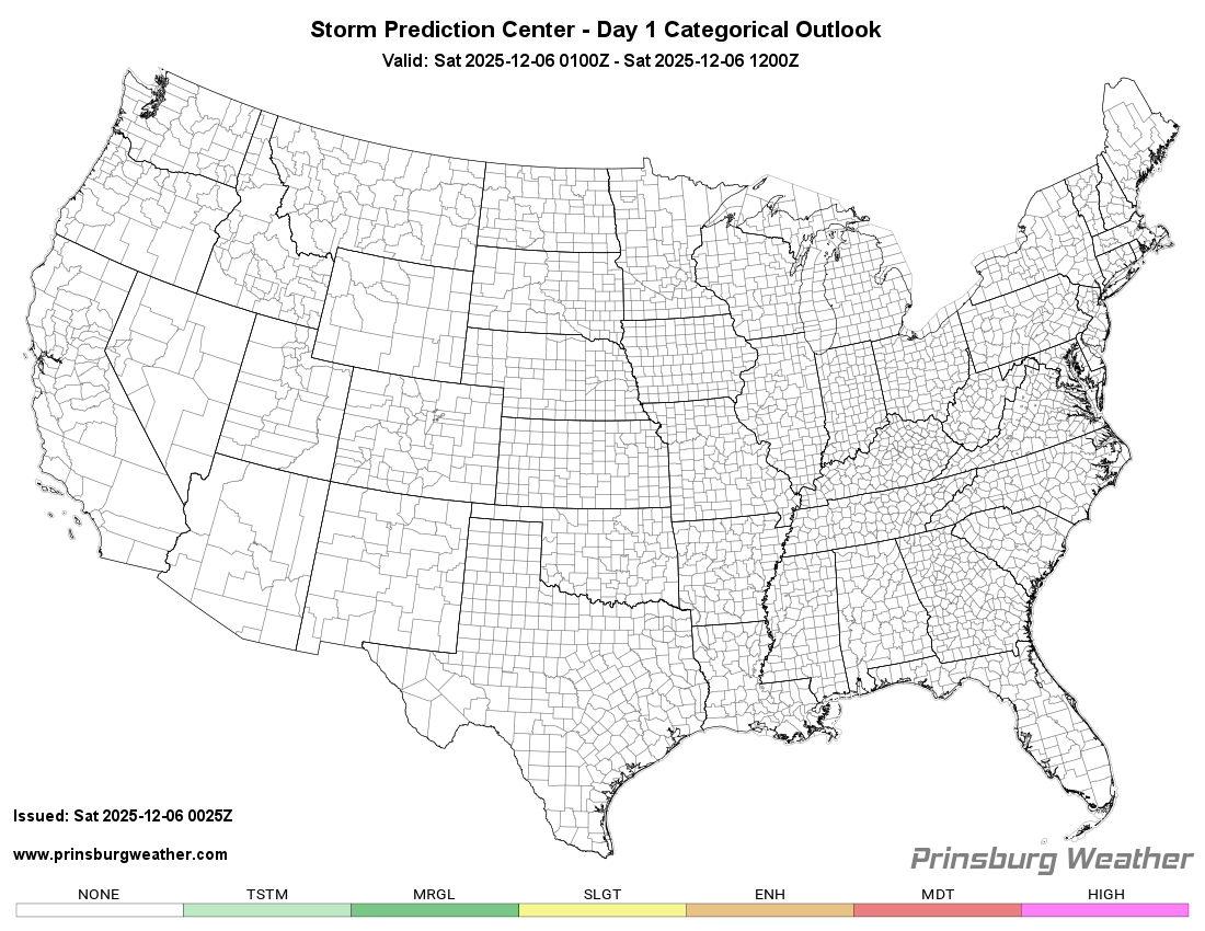 ACUS01 KWNS 060027 SWODY1 SPC AC 060025 Day 1 Convective Outlook NWS Storm Prediction Center Norman OK 0625 PM CST Fri Dec 05 2025 Valid 060100Z - 061200Z ...NO THUNDERSTORM AREAS FORECAST... ...SUMMARY... Thunderstorm potential is negligible tonight. ...01 Update... Surface front has advanced across the northern FL Peninsula early this evening. Weak convection is noted along/behind this boundary, but the more robust updrafts are now offshore where isolated flashes of lightning are noted off the GA Coast. Latest diagnostic data does not appear particularly favorable for deep convection along the wind shift tonight, and post frontal elevated buoyancy is expected to remain quite weak. Current thinking is the primary risk for isolated thunderstorms will be well off the GA/SC Coasts. ..Darrow.. 12/06/2025 $$